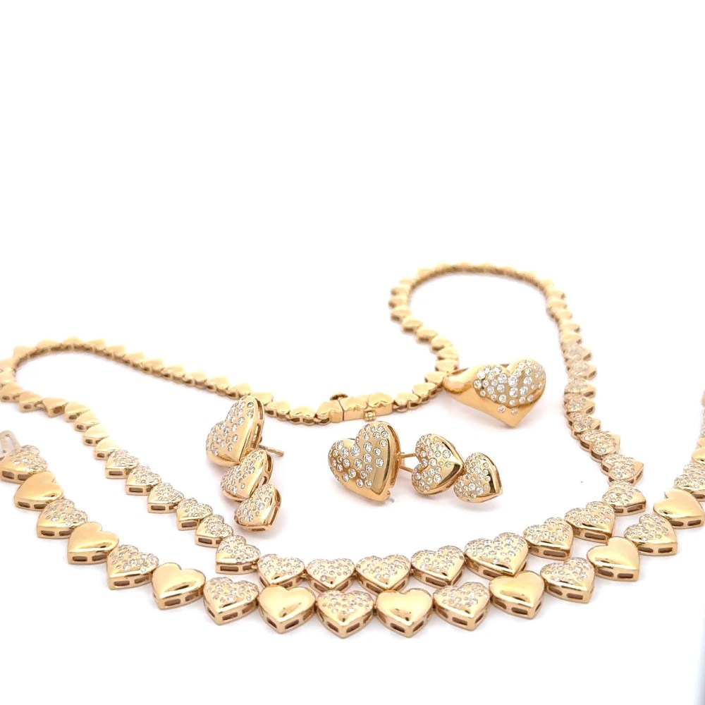 The Luxury Dazzle Hearts Necklace features an elegant gradient of heart motifs, transitioning from diamond-studded hearts at the centre to polished gold towards the clasp. With over 500 natural diamonds and a fluid 17-inch design, it balances delicacy with presence. Complementing it are the Luxury Dazzle Hearts Bracelet, set with nearly 300 diamonds, and the Luxury Dazzle Detachable Heart Earrings, which can be worn as understated studs or transformed into bold evening earrings with a detachable element. The Luxury Dazzle Detachable Ring completes the collection, offering versatility and sculptural elegance in one design.